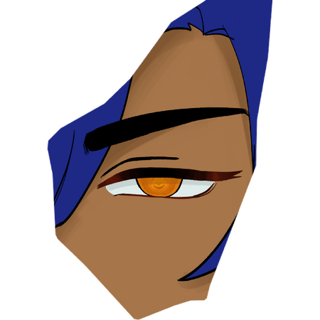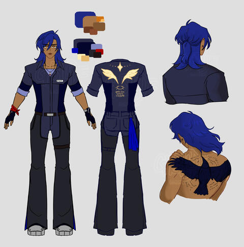 Morgan is brown-skinned, his top lip stylistically colored a darker shade than his bottom. His hair is dark blue and rather shaggy, stopping just past his shoulders and kept half up in a ponytail. His eyes are a gold/amber shade, the pupils drawn as a shade lighter than his irises. He wears a serious expression, as if troubled.Morgan wears faded blue coveralls with the sleeves folded up to his elbows and the collar unbuttoned slightly to reveal the shirt he wears underneath it. He wears leather gloves on both hands, wearing a red bandana around his right wrist and a digital watch on his left. Over his coveralls, Morgan wears leather riding chaps that flare out into a bell bottom style, and split with a blue accent. He wears old work boots, worn and stressed from years of work, and a tool belt with the necessary equipment. In his back pocket is a work towel.Depicted in his Eidolon 6 art, Morgan has a tattoo of a crow with its wings spread open on his back.